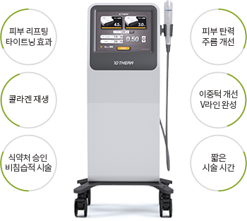 10THERA는 동시 2라인 조사 방식의 고강도 집속 초음파(HIFU) 의료기기로 진피층과 SMAS층에 60~80도의 열을 발생시켜 열 응고점을 형성하고 콜라겐섬유와 탄력섬유를 재생시켜 피부 리프팅 및 탄력개선 효과를 냅니다.